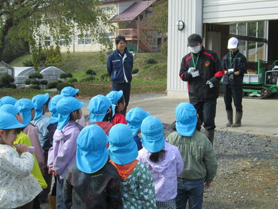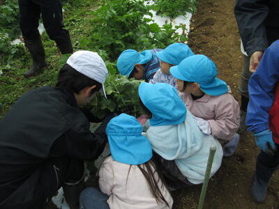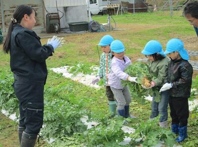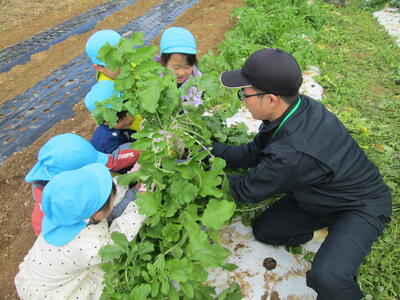 11月29日に本校農場で愛耕幼稚園年長クラスの園児がダイコンの収穫体験を行いました。本校農業選択3年次4名がダイコンの収穫の方法を園児に教え、みんなで協力してダイコンを収穫しました。なかなか抜けずに苦戦しているチームもありましたが、途中で折らずに収穫できると、大きいダイコンを頭上に掲げて喜んでいました。最後に本校生徒が「好き嫌いせずに野菜をたくさん食べてね!」という呼びかけに大きな声で返事をして喜んでいました。収穫したダイコンは園で調理しみんなで味わうそうです。